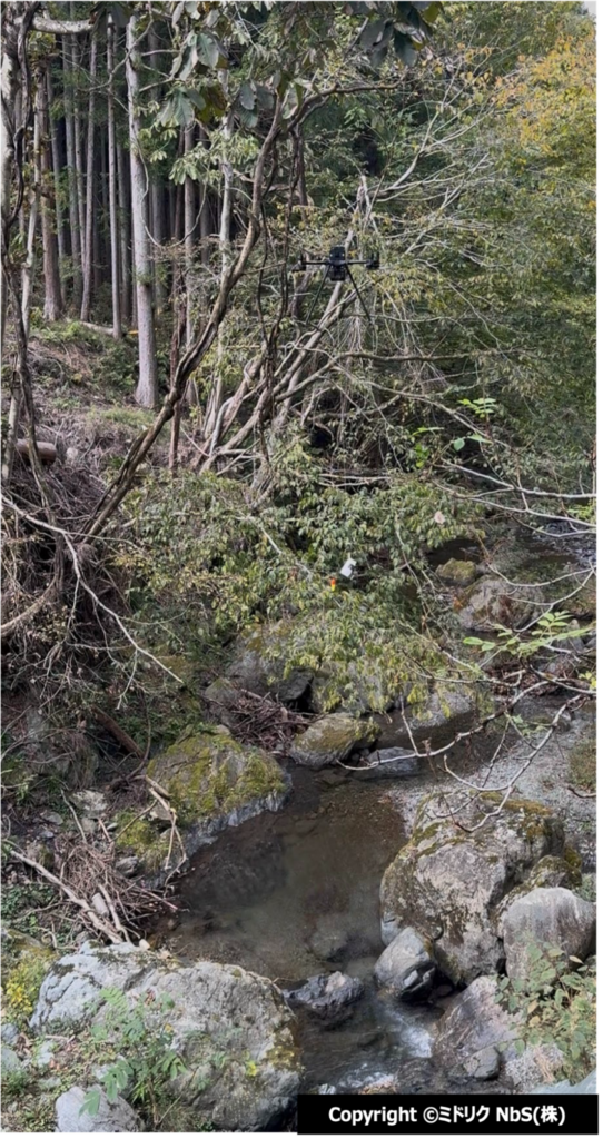 上流域では、秩父地域の森林整備地区を対象に、ミドリク(Midriq)が技術支援として入り、ドローン・SLAM(LiDAR)による、森林の三次元データ取得による森林毎木調査・管理の効率化、CO2固定量の算定、独自のドローン採水型環境DNA調査による対象エリアの生物多様性データの解析などを通じて自然資本の状態を把握しました。