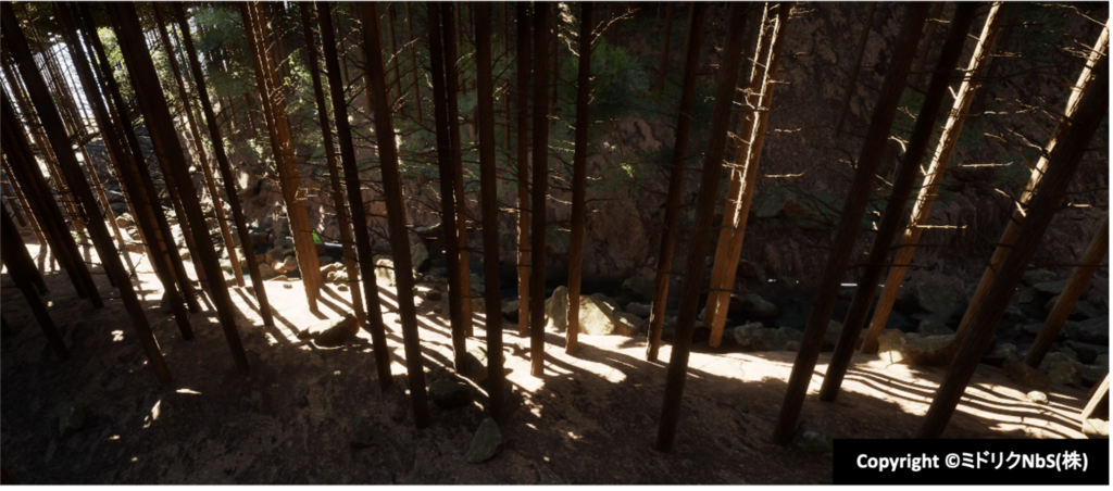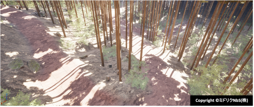 このように構築したデジタルツインは、単なる再現にとどまらず、森林整備の効果や水の流れ、生態系の変化などを事前に検討するためのシミュレーション環境としても活用することができます。